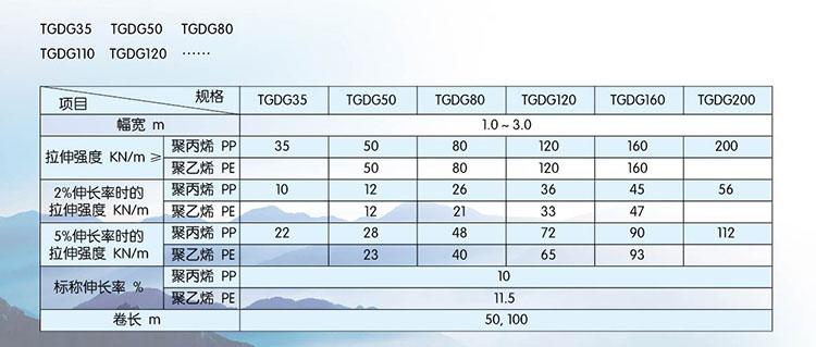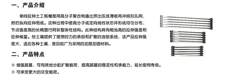 單向拉伸聚丙烯土工格柵是一種以高分子聚合物為主要原料,加入一定的防紫外線、抗老化助劑,經(jīng)過單向拉伸使原來(lái)分布散亂的鏈形分子重新定向排列呈線性狀態(tài),經(jīng)擠出壓成薄板再?zèng)_規(guī)則孔網(wǎng),然后縱向拉伸而成的高強(qiáng)度土工材料。這種過程中使高分子成定向線性狀態(tài)并形成分布均勻、節(jié)點(diǎn)強(qiáng)度高的長(zhǎng)橢圓形網(wǎng)狀整體性結(jié)構(gòu)。此種結(jié)構(gòu)具有相當(dāng)高的拉伸強(qiáng)度和拉伸模量,抗拉強(qiáng)度達(dá)到100-300KN/m,接近低碳鋼的水平,大大優(yōu)于傳統(tǒng)的或現(xiàn)有的加筋材料,特別是該公司此類產(chǎn)品更具有超國(guó)際水平的高早期(伸長(zhǎng)率在2%—5%)拉伸強(qiáng)度和拉伸模量。給土壤提供了理想的力的承擔(dān)和擴(kuò)散的連鎖系統(tǒng)。該產(chǎn)品拉伸強(qiáng)度大(>150Mpa),適應(yīng)各種土壤。