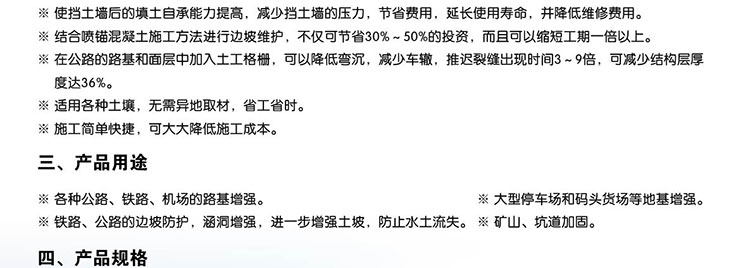 1、高分子成定向線性狀態(tài)并形成分布均勻、節(jié)點(diǎn)強(qiáng)度高的長(zhǎng)橢圓形網(wǎng)狀整體性結(jié)構(gòu)。此種結(jié)構(gòu)具有相當(dāng)高的抗拉強(qiáng)度和剛性,給土壤提供了理想的力的承擔(dān)和擴(kuò)散的連鎖系統(tǒng)。